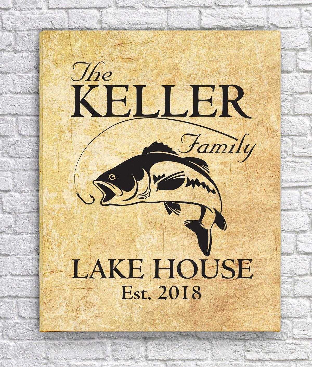 Spruce up the family lake home with this fun fish canvas sign!  Featuring a hook and line set on a worn looking background, this canvas print will stand out in any lake house with it's vintage feel.  Personalize with your family name and an established year. You can choose from a black chalkboard or parchment background, whichever suits your lake home more. This canvas sign makes a great housewarming or gift for a couple as well!