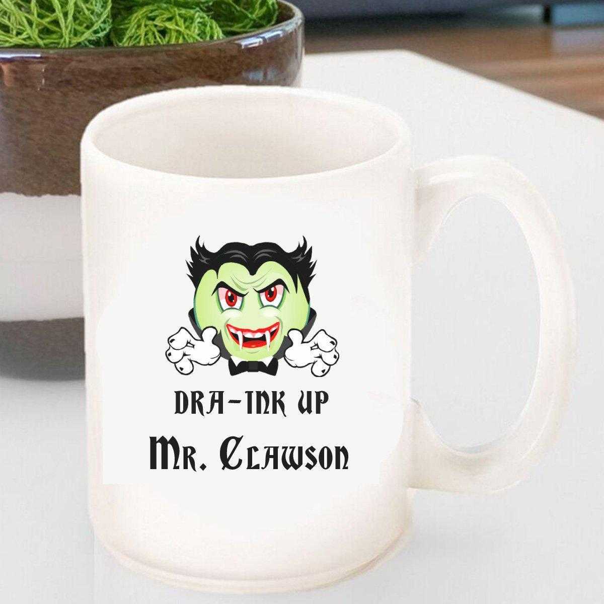 Mix your brew, sip your tea, gulp your coffee in these Personalized Halloween Coffee Mugs! Inspired by classic Fall & Halloween characters, colors and fonts. Personalized your own brew or give your favorite Halloween fan a great gift that says it all!Â