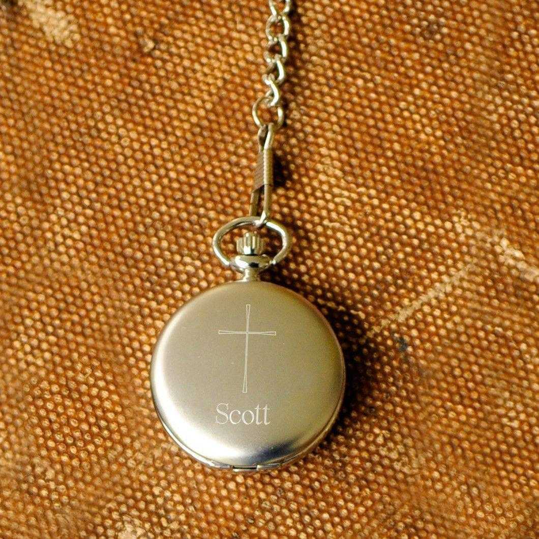 A simple yet handsomely engraved cross adorns this classy Personalized Inspirational Pocket Watch, creating a unique contemporary design. A sturdy chain and clip keep this brushed silver-toned watch secure and one line of personalization provides room for a name or other sentiment. Featuring Quartz movement.